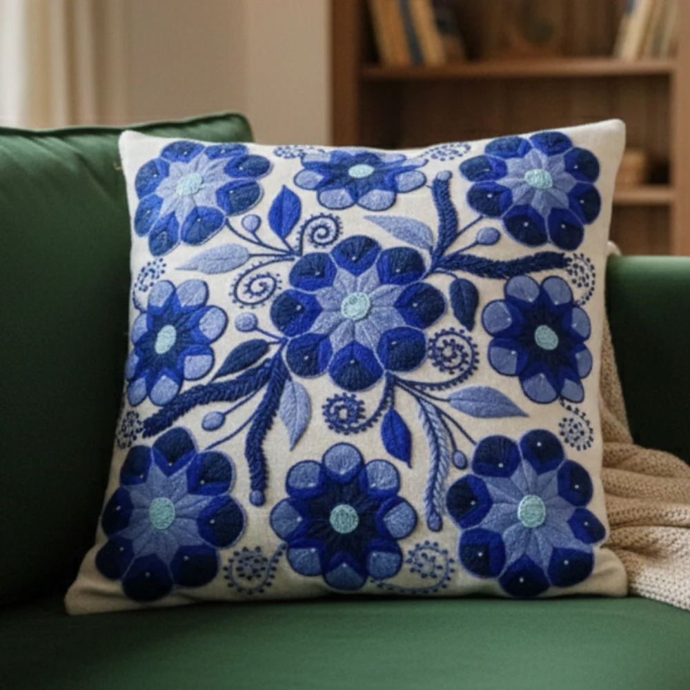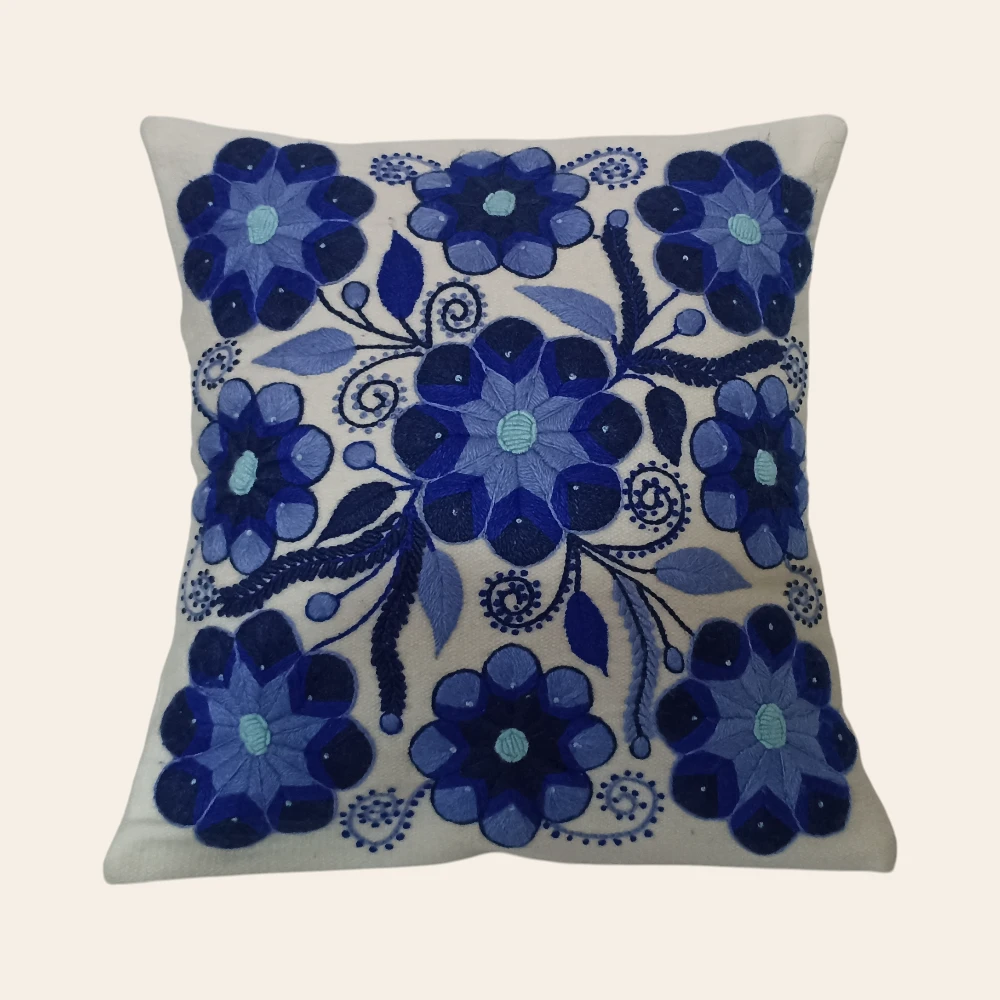 Be the first to review “Funda de cojin blanco con bordados de flores azul”